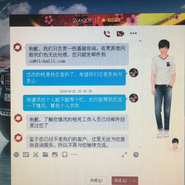 我是邵海南我在tickmill平台上的账号是63952我在2019年年底至2020年3月期间在tickmill平台操作导致异常亏损90万元人民币左右,之后又陆续入金30余万元人民币操作期间盈利到账户金额达到80余万人民币,我在8月26日申请出金,但钱迟迟不到账,咨询tickmill客服后,次日发现我的账号无法登陆。之前给tickmill发信询问过为何在不通知本人的情况下账户还有80余万人民币资金交易的情况下注销我的账号,tickmill说收到过我申请注销的邮件?我也明确的告知tickmill我没有给tickmill发过任何要求你们操作我账号的邮件,况且我账户里有钱tickmill注销也应当把账户名下的资金返回了才能注销。tickmill在没有任何我本人授权也没有退回我账户资金的情况下,私自注销我的账户tickmill已经违法了。我现在非常质疑tickmill的合法性。tickmill必须给我一个合理的解释。另外关于此事我多次多方面向贵平台沟通,平台态度都非常的消极和冷淡,并且他们客户还故意删除我沟通时的联系方式,请各位汇友和媒体帮忙多多曝光和维权。