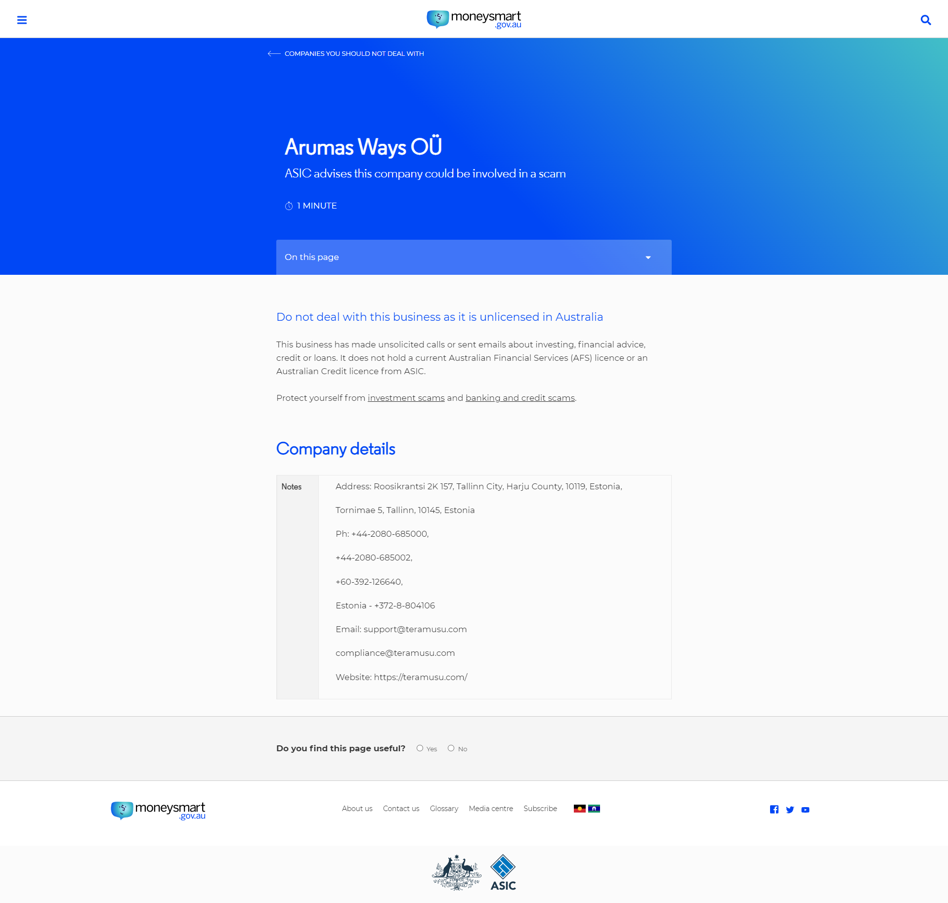 arumas तरीके या asic सलाह देते हैं कि यह कंपनी स्कैम पेज रीडिंग टाइम में शामिल हो सकती है: इस पेज पर 1 मिनट इस व्यवसाय से संबंधित नहीं है क्योंकि यह ऑस्ट्रेलिया में बिना लाइसेंस के है, इस व्यवसाय ने निवेश, वित्तीय सलाह, क्रेडिट के बारे में अवांछित कॉल या ईमेल भेजे हैं या ऋण। इसके पास वर्तमान ऑस्ट्रेलियाई वित्तीय सेवा (AFS) लाइसेंस या ASIC का ऑस्ट्रेलियाई क्रेडिट लाइसेंस नहीं है। निवेश घोटालों और बैंकिंग और क्रेडिट घोटालों से खुद को बचाएं। कंपनी विवरण नोट पता: roosikrantsi 2k 157, तेलिन शहर, हार्जू काउंटी, 10119, एस्टोनिया, tornimae 5, तेलिन, 10145, एस्टोनिया ph: +44-2080-685000, +44-2080-685002, +60-392-126640, एस्टोनिया - +372-8-804106 ईमेल: support@ TeraMusu .com अनुपालन@ TeraMusu कॉम वेबसाइट: https:// TeraMusu .com/