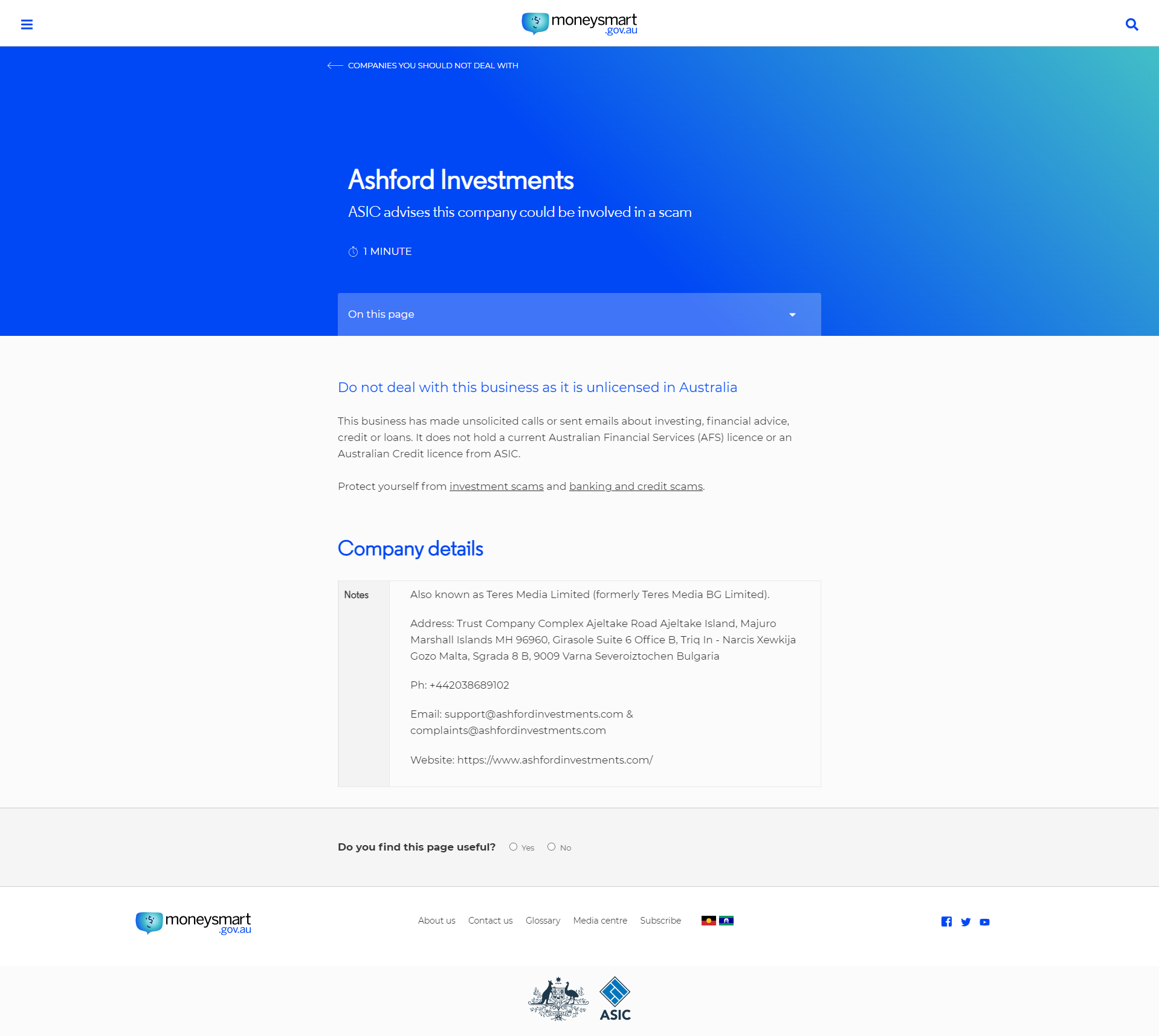 निवेशक चेतावनी सूची एशफोर्ड इन्वेस्टमेंट्स ASIC सलाह देता है कि यह कंपनी एक घोटाले में शामिल हो सकती है.