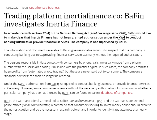 ट्रेडिंग प्लेटफॉर्म inertiafinance.co: BaFin Inertia Finance की जांच करता है