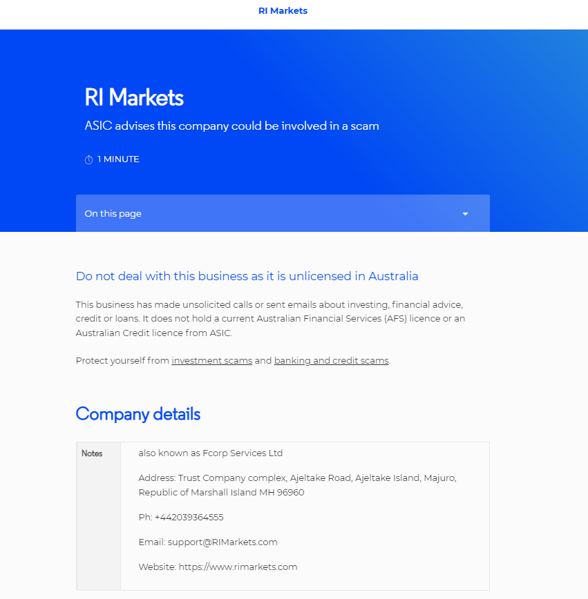 निवेशक चेतावनी सूची आरआई मार्केट्स एएसआईसी सलाह देता है कि यह कंपनी एक घोटाले में शामिल हो सकती है.