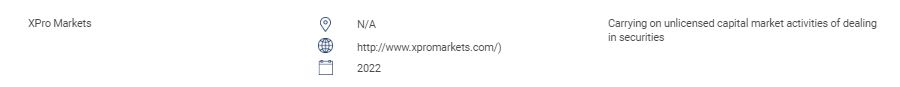 "इस अनुभाग में अनधिकृत वेबसाइटों, निवेश उत्पादों, कंपनियों और व्यक्तियों की सूची शामिल है। इस सूची में शामिल हैं: एससी से लाइसेंस के बिना निम्नलिखित विनियमित गतिविधियों को करने वाले या खुद को संचालित करने वाले व्यक्ति: प्रतिभूतियों में लेनदेन; डेरिवेटिव में लेनदेन; फंड प्रबंधन; कॉर्पोरेट वित्त पर सलाह देना; निवेश सलाह; वित्तीय नियोजन; और निजी सेवानिवृत्ति योजनाओं में काम करना। प्राधिकरण के बिना किसी मान्यता प्राप्त बाजार का संचालन करने वाले व्यक्ति। अनुमोदन, प्राधिकरण या मान्यता के बिना प्रतिभूतियां जारी करने या पेश करने वाले व्यक्ति। एससी के लोगो का दुरुपयोग करने वाले और एससी को गलत तरीके से प्रस्तुत करने वाले व्यक्ति। " XPro Markets n/a http://www.xpromarkets.com/) 2022 प्रतिभूतियों में लेनदेन की बिना लाइसेंस वाली पूंजी बाजार गतिविधियों को जारी रखना