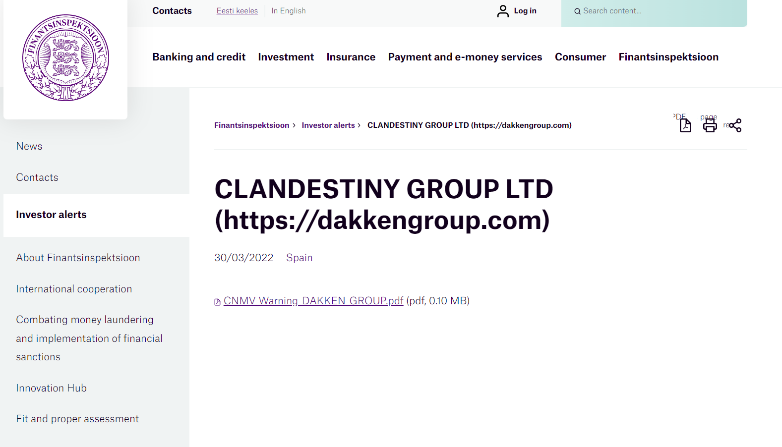 निवेशक चेतावनी - क्लैंडेस्टिनी ग्रुप लिमिटेड.