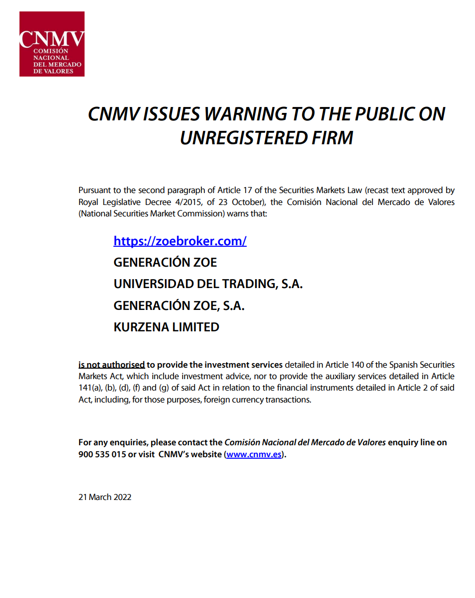 जेनरेशन ज़ो यूनिवर्सिडैड डेल ट्रेडिंग, एसए जेनरेशन ज़ो, एसए कुर्ज़ेना लिमिटेड (https://zoebroker.com) 23/03/2022 स्पेन सीएनएमवी ने प्रतिभूति बाजार कानून के अनुच्छेद 17 के दूसरे पैराग्राफ के अनुसार अपंजीकृत फर्म पर जनता को चेतावनी जारी की है। (23 अक्टूबर के रॉयल लेजिस्लेटिव डिक्री 4/2015 द्वारा अनुमोदित पुनर्पाठ पाठ), कॉमिसियोन नैशनल डेल मर्काडो डी वैलोरेस (राष्ट्रीय प्रतिभूति बाजार आयोग) ने चेतावनी दी है कि: जेनेरासिओन ज़ो यूनिवर्सिडैड डेल ट्रेडिंग, एसए जेनरेशियन ज़ो, एसए कुर्ज़ेना लिमिटेड जेनरेशियन ज़ो अधिकृत नहीं है स्पैनिश सिक्योरिटीज मार्केट एक्ट के अनुच्छेद 140 में विस्तृत निवेश सेवाएं प्रदान करना, जिसमें निवेश सलाह शामिल है, न ही अनुच्छेद 141(ए), (बी), (डी), (एफ) और (जी) में विस्तृत सहायक सेवाएं प्रदान करना। उक्त अधिनियम के अनुच्छेद 2 में वर्णित वित्तीय साधनों के संबंध में, उन उद्देश्यों के लिए, विदेशी मुद्रा लेनदेन सहित। किसी भी पूछताछ के लिए, कृपया 900 535 015 पर कोमिसियोन नैशनल डेल मर्काडो डी वेलोरेस पूछताछ लाइन से संपर्क करें या सीएनएमवी की वेबसाइट (www.cnmv.es) पर जाएं। 21मार्च 2022