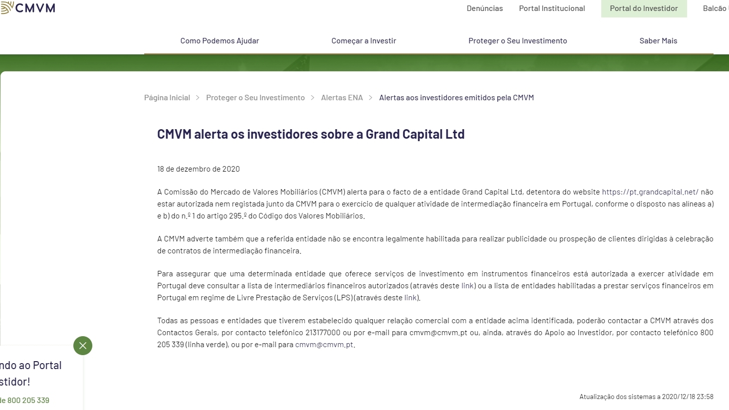 - सजा का कारणप्रतिभूति बाजार आयोग (सीएमवीएम) इस तथ्य के प्रति सचेत करता है कि इकाई Grand Capital ltd , वेबसाइट https://pt.grandcapital.net/ का मालिक लेख के पैराग्राफ 1 के पैराग्राफ ए) और बी) के प्रावधानों के अनुसार, पुर्तगाल में किसी भी वित्तीय मध्यस्थता गतिविधि को करने के लिए सीएमवीएम के साथ अधिकृत या पंजीकृत नहीं है। प्रतिभूति संहिता का 295वाँ भाग।