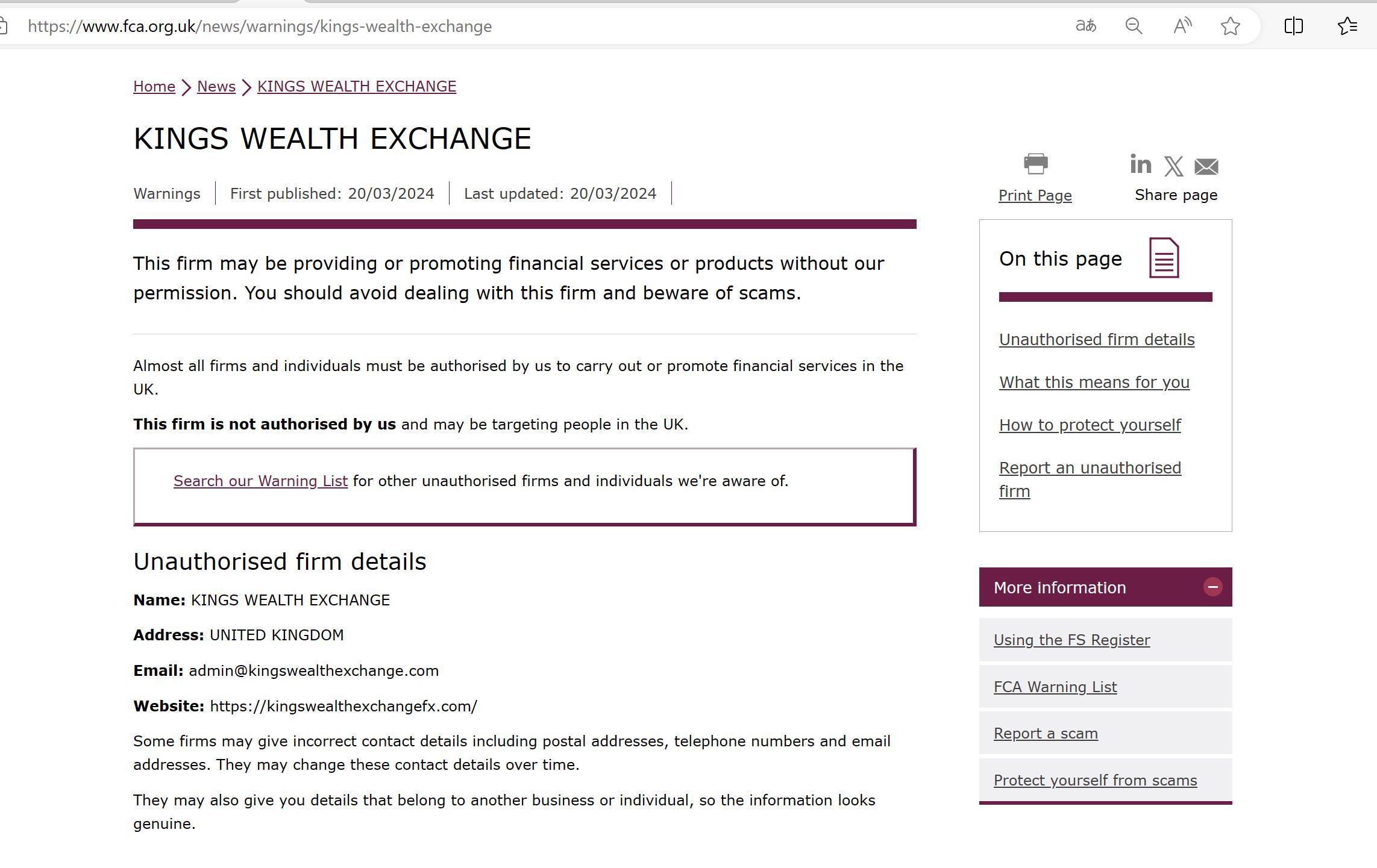 FCA द्वारा अनधिकृत फर्मों की चेतावनी सूची KINGS WEALTH EXCHANGE.