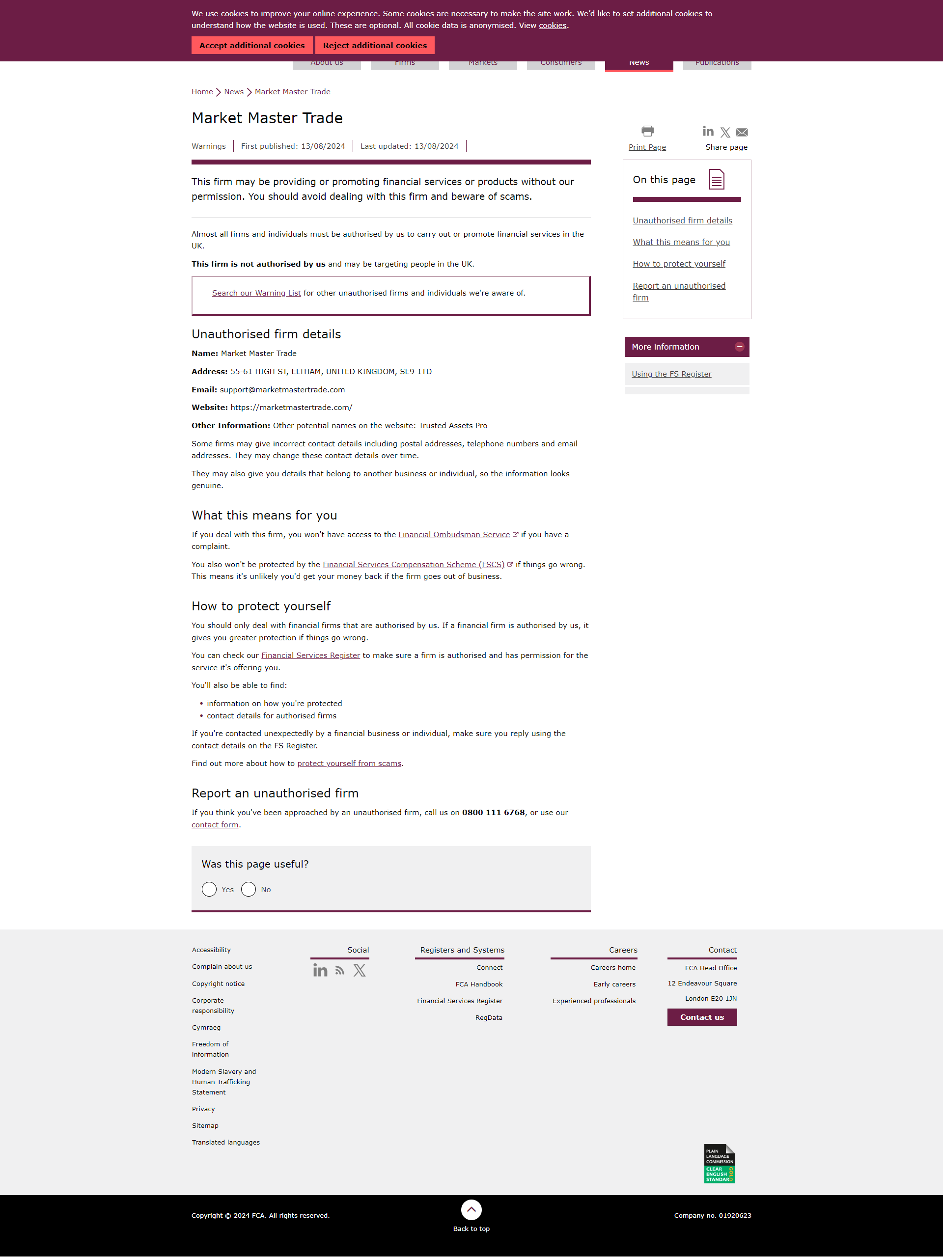 एफसीए की अनधिकृत फर्मों की चेतावनी सूची मार्केट मास्टर ट्रेड.