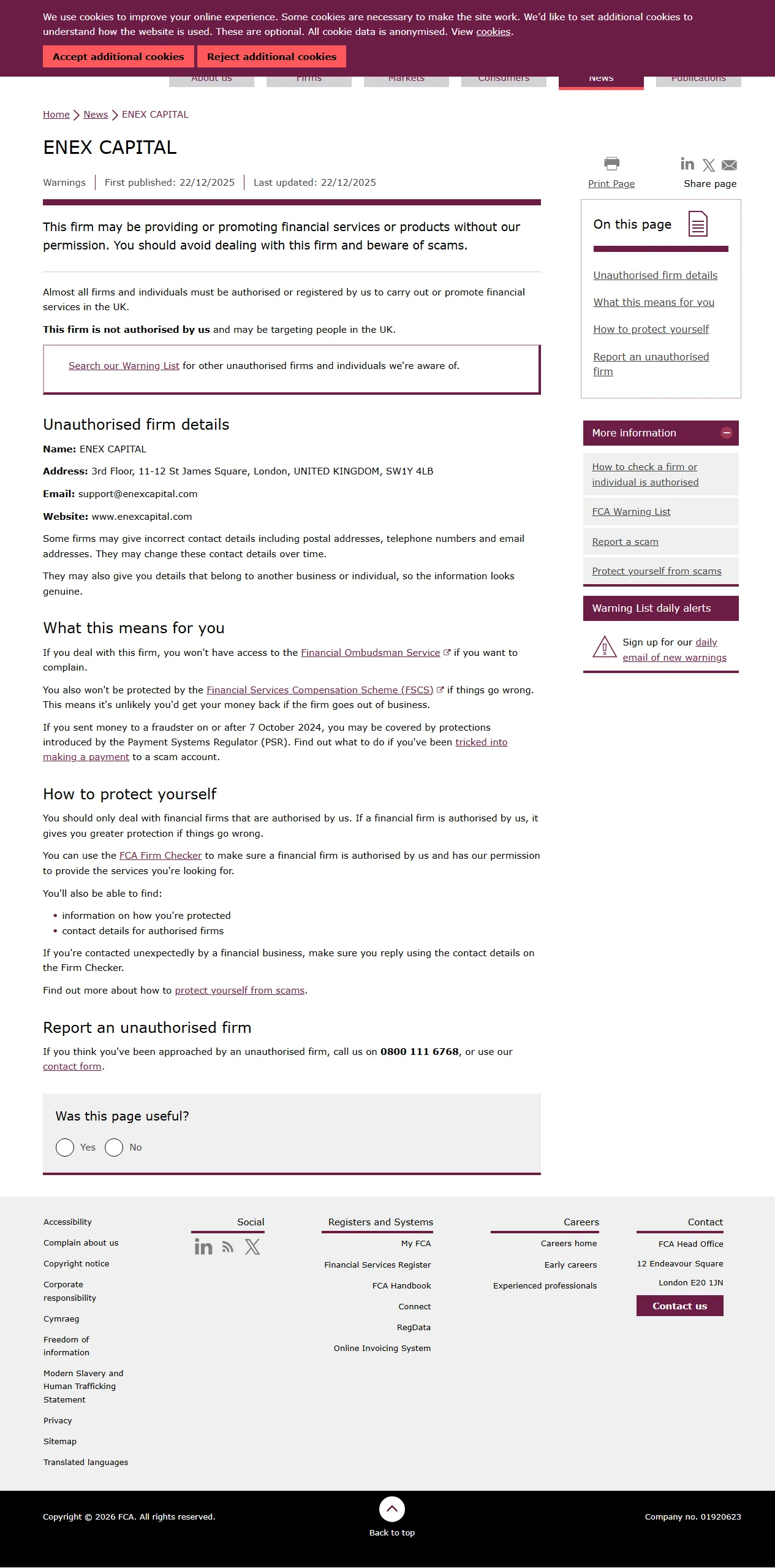 FCA अनधिकृत फर्मों की चेतावनी सूची ENEX CAPITAL.