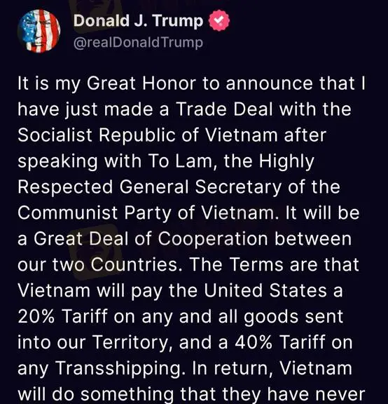 (Gambar 1: Trump mengumumkan kesepakatan tarif AS-Vietnam; Sumber: Platform Sosial Resmi)