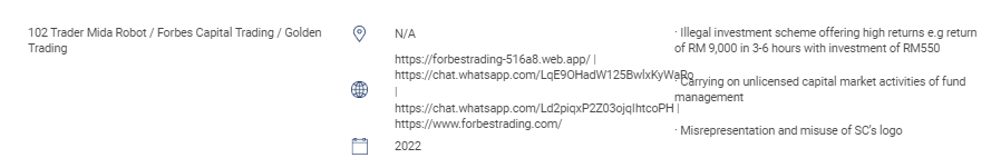 "Bagian ini berisi daftar situs web, produk investasi, perusahaan, dan individu yang tidak sah. Daftar ini mencakup: Orang-orang yang melakukan atau menganggap dirinya melakukan kegiatan yang diatur berikut ini tanpa izin dari SC: Transaksi sekuritas; Transaksi derivatif; Pengelolaan dana; Memberi nasihat tentang keuangan perusahaan; Saran investasi; Perencanaan keuangan; dan Berurusan dalam skema pensiun swasta Orang yang mengoperasikan pasar yang diakui tanpa izin Orang yang menerbitkan atau menawarkan sekuritas tanpa persetujuan, izin atau pengakuan Orang yang menyalahgunakan logo SC dan salah menggambarkan SC. " 102 Trader Mida Robot / Forbes Capital Trading / Golden Trading N/A https://forbestrading-516a8.web.app/ | https://chat.whatsapp.com/LqE9OHadW125BwlxKyWaRo | https://chat.whatsapp.com/Ld2piqxP2Z03ojqIhtcoPH | https://www.forbestrading.com/ 2022 · Skema investasi ilegal yang menawarkan pengembalian tinggi misalnya pengembalian RM 9,000 dalam 3-6 jam dengan investasi RM550 · Melakukan kegiatan pasar modal tanpa izin pengelolaan dana · Representasi yang keliru dan penyalahgunaan logo SC