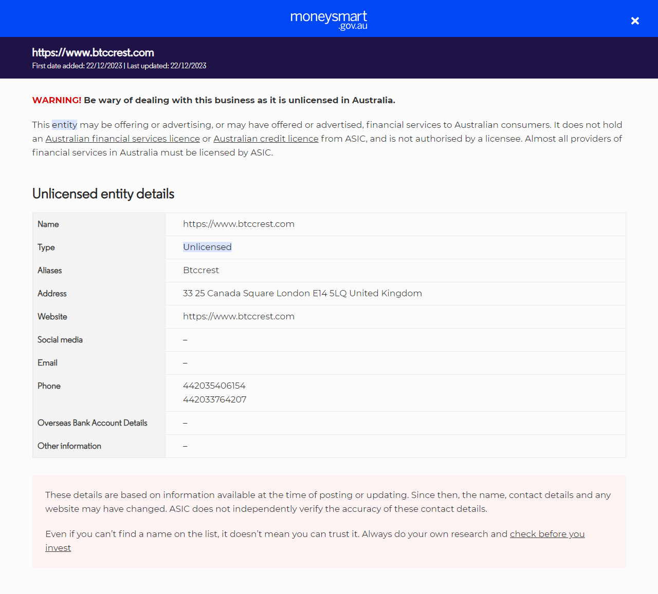 JenisPenawaran tidak berlisensiMenawarkan layanan keuangan (termasuk produk keuangan) kepada orang-orang di Australia tanpa lisensi. Mereka tidak memegang lisensi layanan keuangan Australia (AFS) atau lisensi kredit Australia dari ASIC.