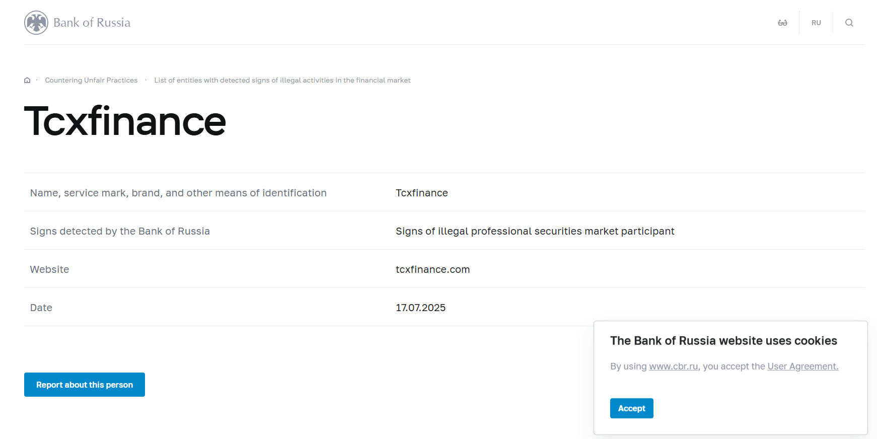 Nama, tanda jasa, merek, dan sarana identifikasi lainnya Tcxfinance Tanda-tanda yang terdeteksi oleh Bank Rusia Tanda-tanda peserta pasar sekuritas profesional ilegal Situs web tcxfinance.com Tanggal 17.07.2025.