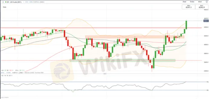 WikiFX Notizie (26 novembre) - Mercoledì, il greggio WTI si è stabilizzato a $ 45,0 e ha raggiunto un massimo intraday di $ 46,24, un nuovo massimo di otto mesi e mezzo dal 6 marzo. Tuttavia, i prezzi del petrolio devono ancora affrontare rischi a breve termine.