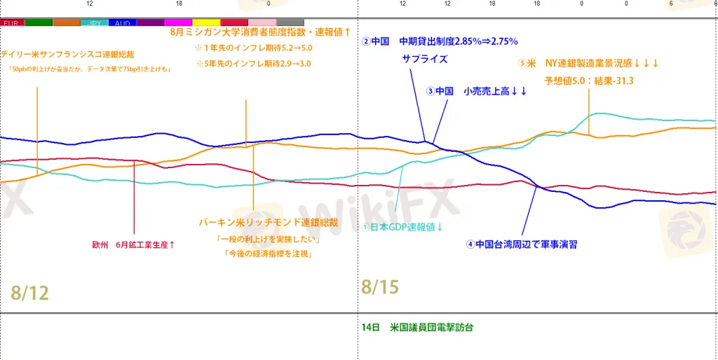 欧州市場は❹中国が台湾周辺で軍事演習を行うとリスクオフの流れとなり、ドルと円が買われ、オセアニア通貨は売られました。