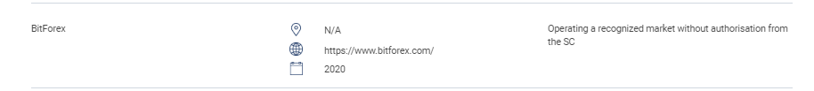 「このセクションには、無許可の Web サイト、投資商品、企業、個人のリストが含まれています。このリストには、SC からのライセンスを受けずに次の規制対象活動を実行している、または実行しているとしている人物が含まれます。資金管理、コーポレートファイナンスに関するアドバイス、投資アドバイス、財務計画、民間退職金制度の取り扱い 認可を受けずに承認された市場を運営する者 承認、許可、承認なしに有価証券を発行または提供する者 SC のロゴを悪用し、SC を虚偽表示する者」 BitForex該当なし https://www. BitForex .com/ 2020 は、SC の許可なしに認められた市場を運営しています。