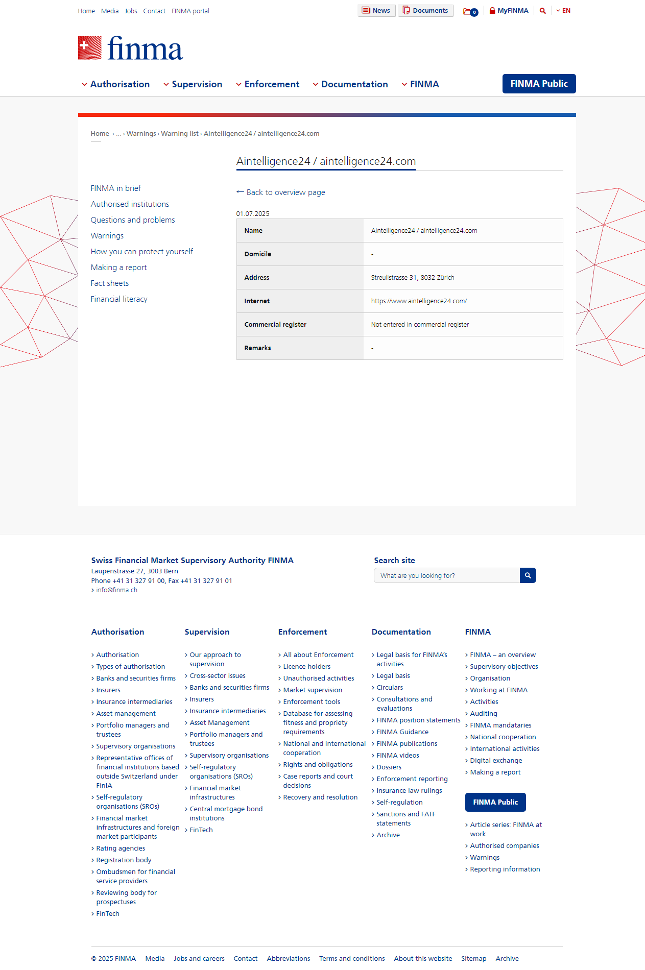 無許可の企業および個人に関する警告リスト 公衆への警告 FINMAAintelligence24 / aintelligence24.com によって監督されていない、無許可のサービスを提供している可能性のある企業および個人の警告リスト.