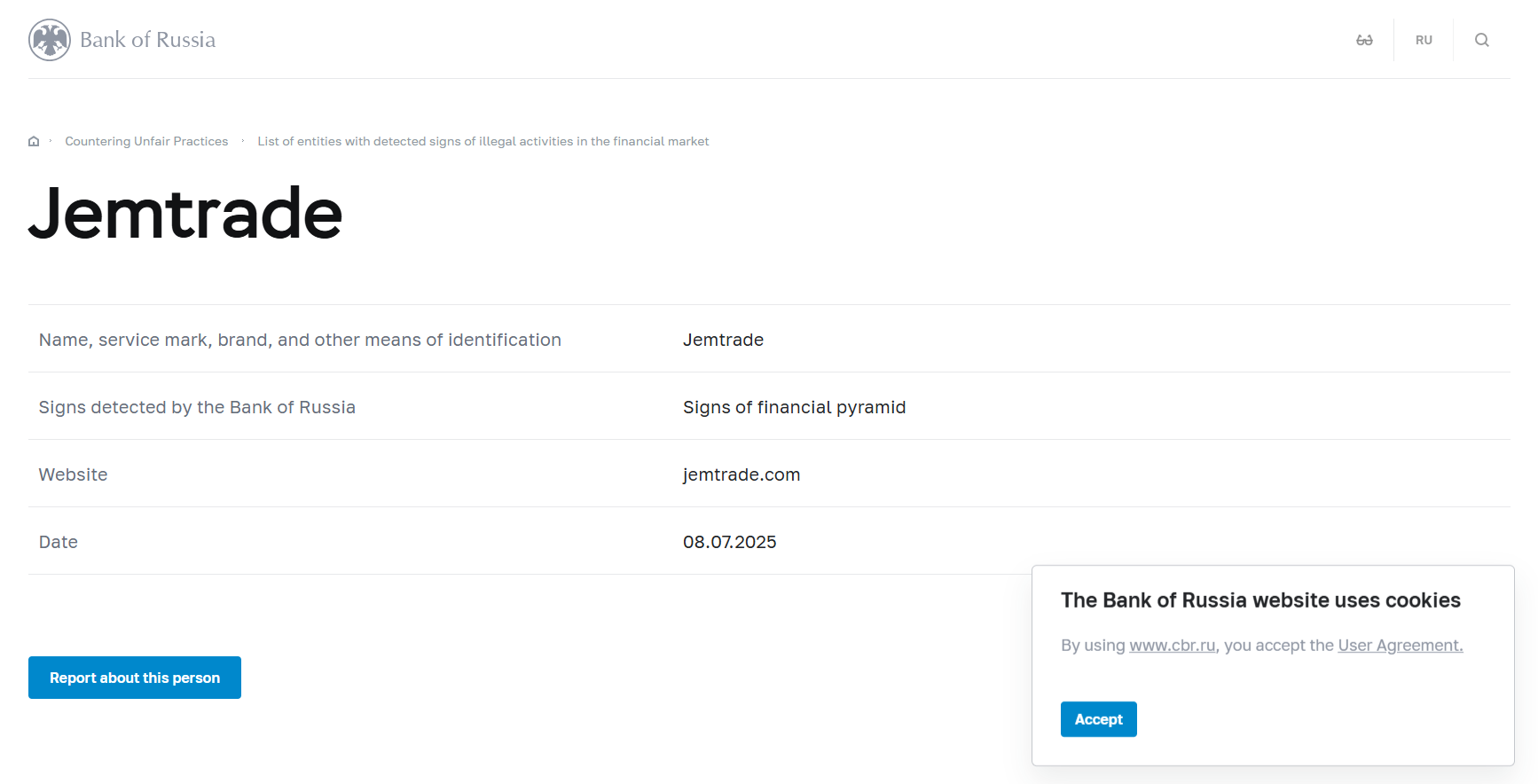 金融市場における違法行為の兆候が検出されたエンティティのリスト Jemtrade.