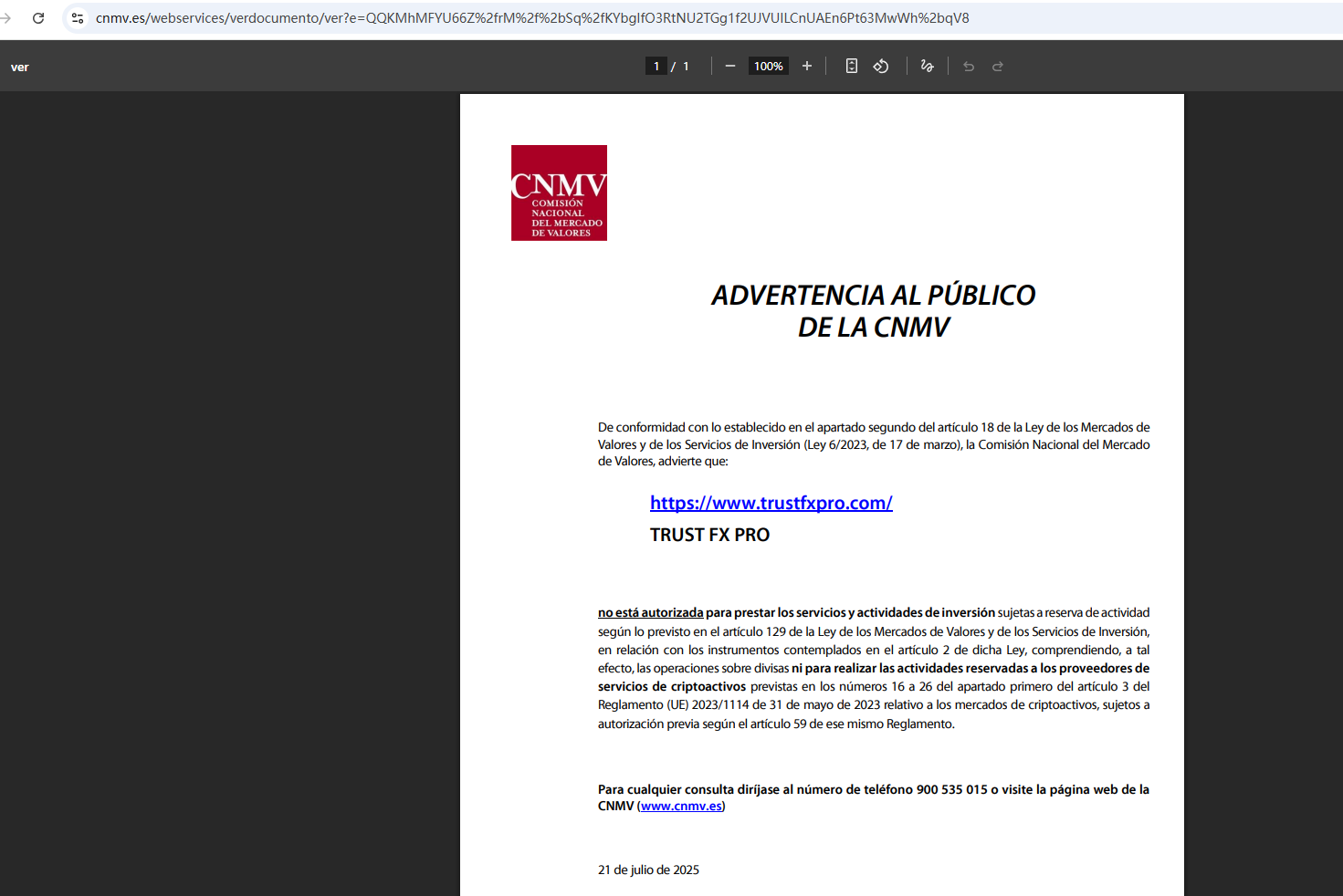 ご質問がある場合は、電話番号900 535 015までお問い合わせいただくか、CNMVのウェブサイト(www.cnmv.es)をご覧ください。