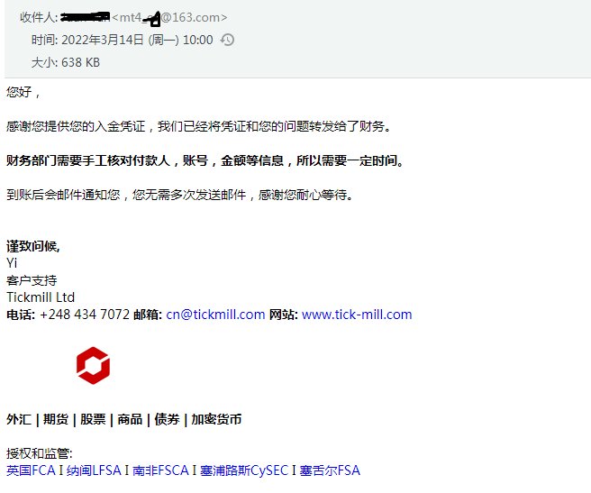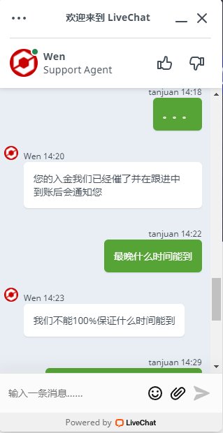3月13日入金存款,并发送了相关凭证到Tickmill指定邮箱,对方也回复收到了。本来说的两个工作日到,但是到现在还没到。 客服回复也不知道什么时候能到,太敷衍了事。 这是要跑路的节奏么?