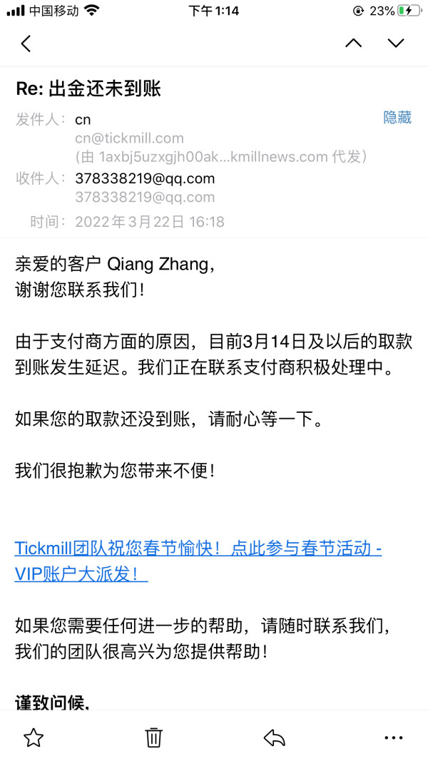 16号出金,客服称2到4个工作日到账。以后查询改为到账,客服称支付商出现问题,让我们等待。再发邮件询问具体时间,出现什么问题,就不回复