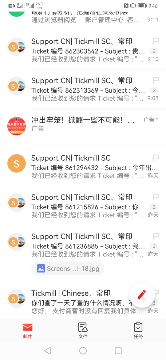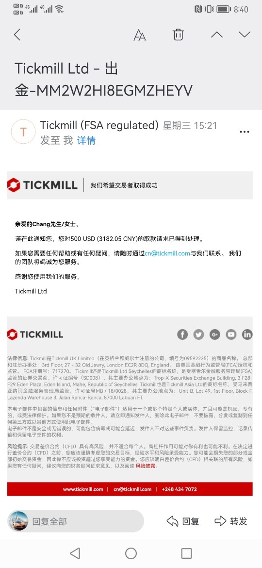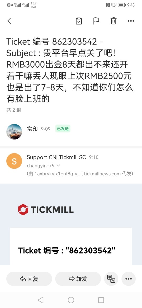tickmill平台要跑吗,2.14日出了400美元等了8天,现在3.6日出的500美到今天没有到账诚若的2-4天发邮件基本上不回要不然就是在联系支付商