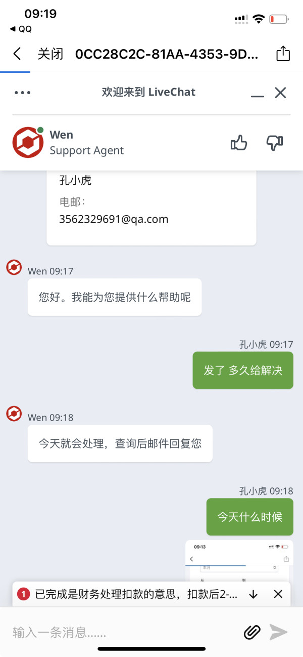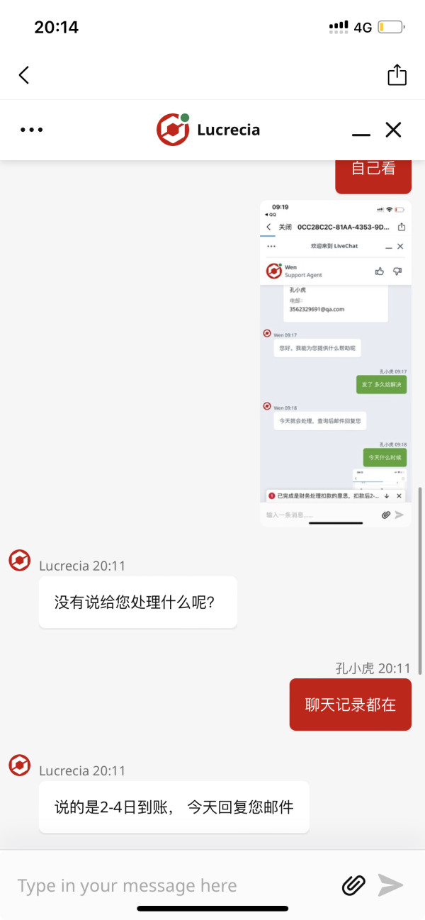 1客服一会说支付商通道有问题延迟出金, 2又说今天给处理 3不给客户处理事情,果断把客服聊天框切段 4总是敷衍2到4个工作日到账