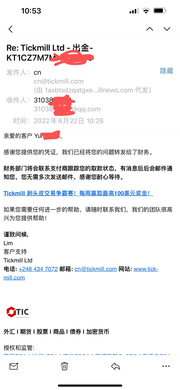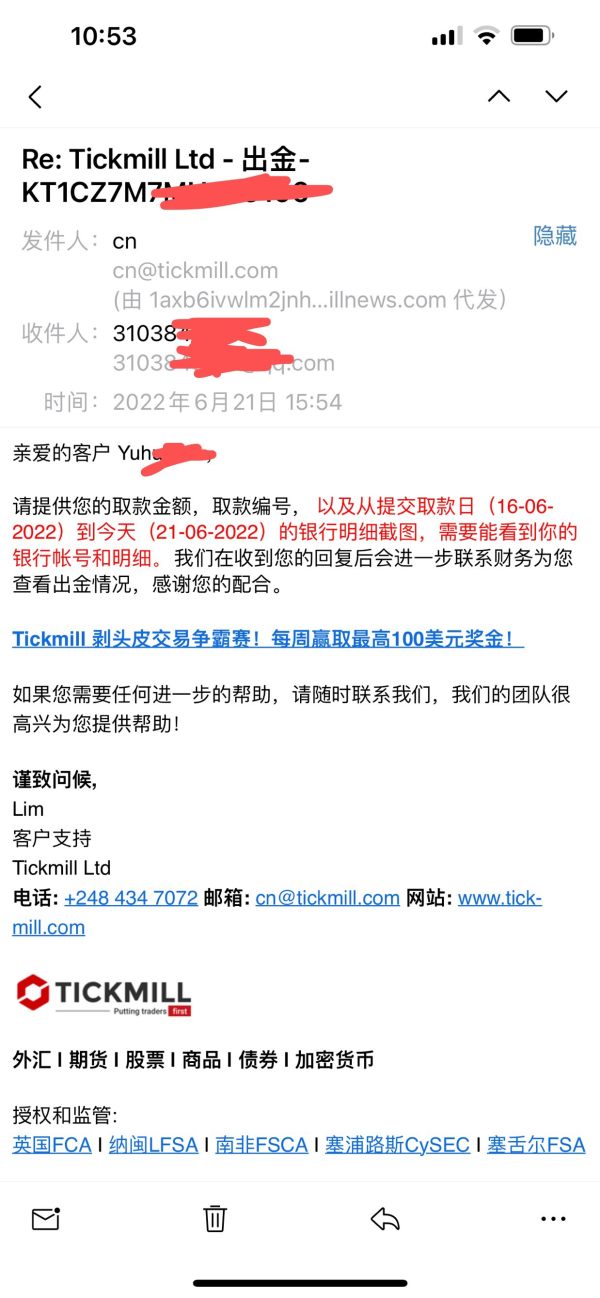 6月16日提交的出款,一万多元,到发稿今日还未到帐,己按照tickmill客服要求提供银行卡交易明细,本人己提供。得到的回复是等待财务部门核实,过去了3个工作日还是没有回复,开户5年多,之前一直比较正常,继续每天发邮件到官网客服,没回复。
