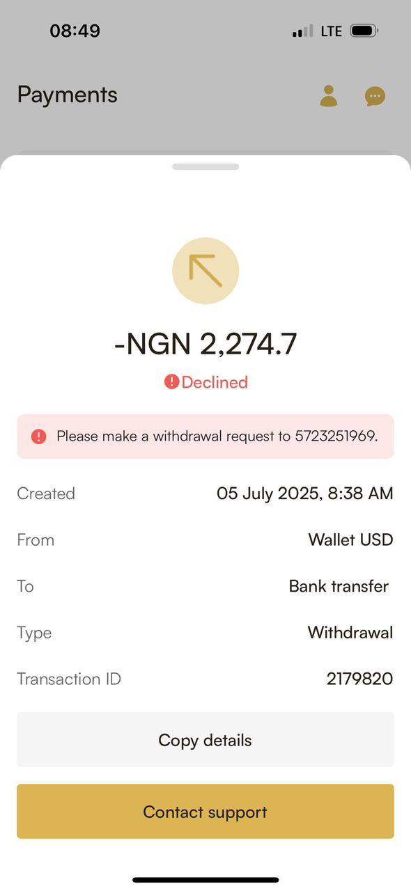Every time I try to withdraw, it keeps getting declined with some random message like this. They don’t let you access your own money easily, and support is of no real help. Feels like they just block withdrawals on purpose.