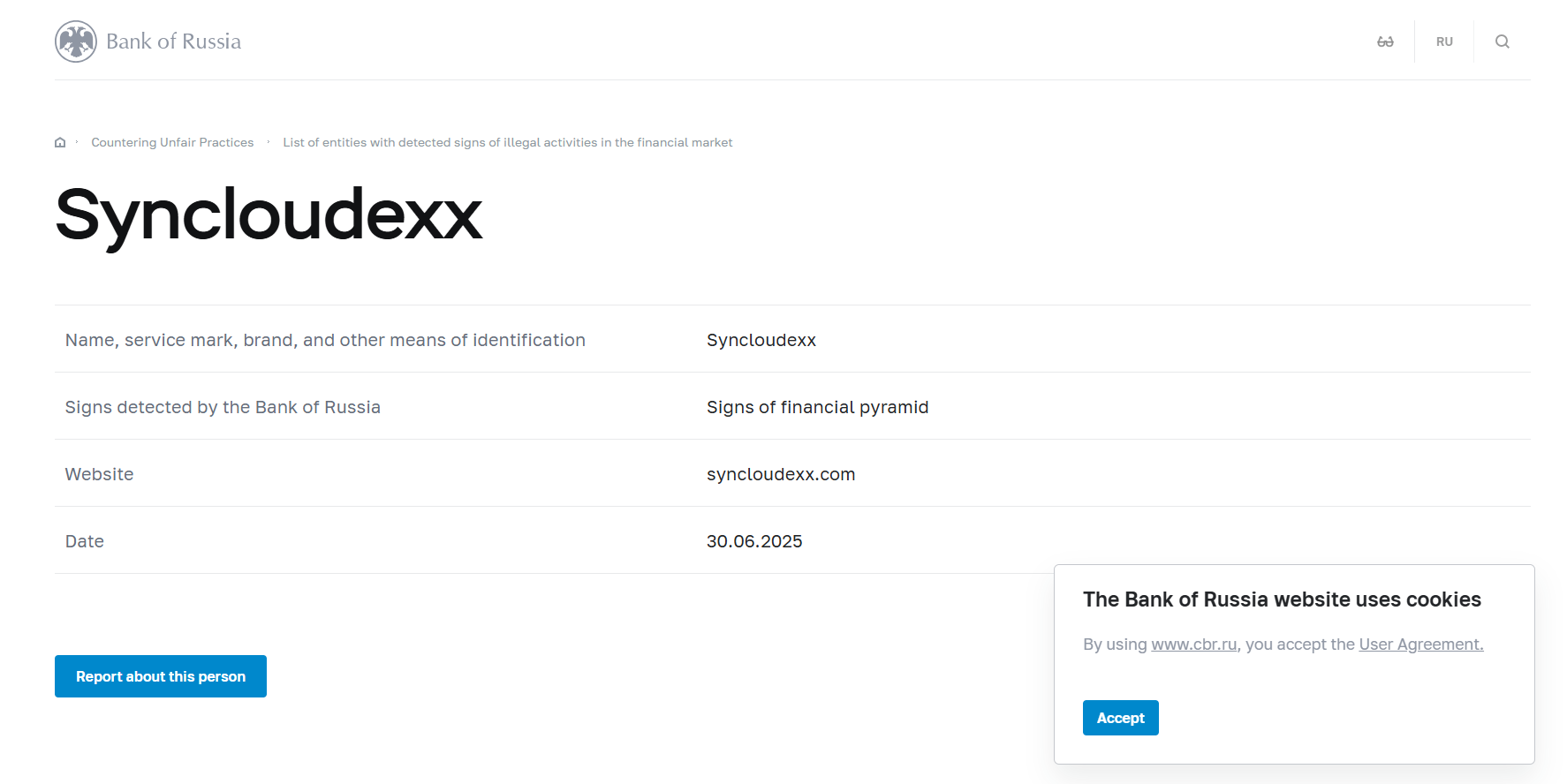 금융 시장에서 불법 활동 징후가 감지된 개체 목록 Syncloudexx.
