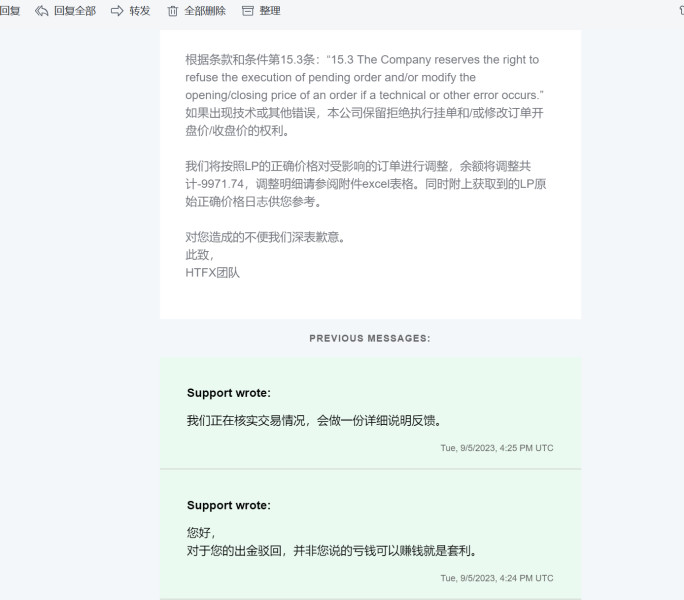 上个月HTFX的人加我说投资外汇交易,有礼品和增金。我上个月入金后一直有亏有赚,前天仓里原油多单一直持有中,随之下午沙特宣布减产原油暴涨。利润很可观兴高采烈地去提交出金,哪知道平台说我套利,我在之前还特意问了业务经理说没有数据持仓限制。现在赚多了开始耍无赖,一开始说我套利,后来第二天发邮件说出现技术错误有权利修改订单。