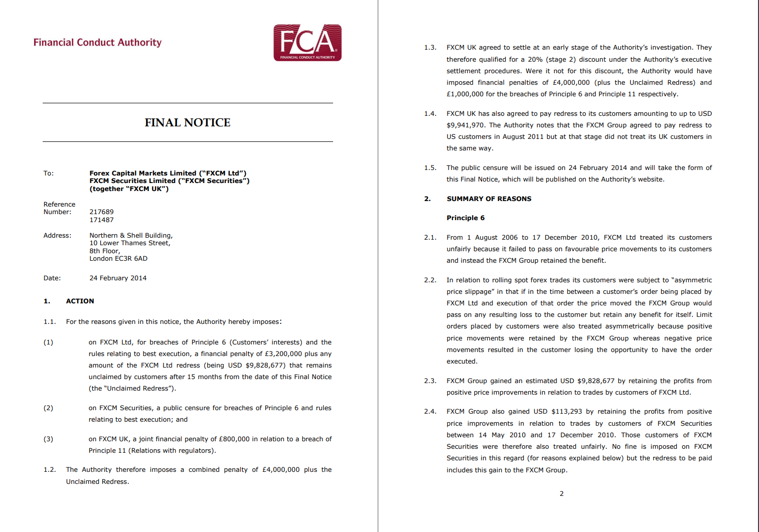 A FXCM UK também não informou à FCA que as autoridades dos EUA estavam investigando outra parte do Grupo FXCM pela mesma má conduta. A FCA garantiu que os clientes da FXCM UK serão totalmente compensados, com crédito pago automaticamente em suas contas. David Lawton, diretor de mercados da FCA, disse: “Quando os consumidores perdem por causa de má conduta, isso mina a confiança na integridade de nossos mercados. A FCA usará todas as ferramentas à sua disposição – supervisão, criação de regras e aplicação – para garantir que as empresas não explorem conflitos de interesse ou a confiança neles depositada por seus clientes.” Tracey McDermott, diretora de fiscalização e crimes financeiros da FCA, disse: “A FXCM UK não apenas não tratou seus clientes de forma justa ou aplicou corretamente nossas regras, como estou particularmente desapontado por não ter sido transparente em suas negociações com a FCA. Esperamos que todas as empresas coloquem os clientes no centro de seus negócios e tomamos medidas para garantir que os clientes da FXCM UK recebam reparação.” A FXCM UK colocou transações cambiais 'de balcão' conhecidas como contratos cambiais à vista em nome de clientes de varejo, que foram então executados por outra parte do Grupo FXCM. Entre agosto de 2006 e dezembro de 2010, o Grupo FXCM manteve os lucros de movimentos de mercado favoráveis entre o momento em que as ordens foram colocadas pela FXCM UK e executadas pelo Grupo FXCM, enquanto quaisquer perdas foram repassadas aos clientes integralmente - uma prática conhecida como preço assimétrico deslizamento. A FXCM UK também falhou em verificar se seus sistemas de execução de ordens eram eficazes e se suas políticas de execução de ordens estavam em conformidade com as regras da FCA sobre a melhor execução. Essas regras exigem que as empresas tomem medidas razoáveis para garantir o melhor negócio possível para seus clientes. A FCA também espera que as empresas tratem seus clientes de forma justa (princípio 6 da FCA) – a FXCM UK ficou aquém desses dois padrões. Em julho de 2010, as autoridades dos EUA iniciaram uma investigação sobre os negócios da FXCM nos EUA. Embora os gerentes seniores do Grupo FXCM fizessem parte do Conselho da FXCM UK e soubessem da investigação, a FXCM UK não alertou a FCA. Isso violou a exigência da FCA de que as empresas sejam abertas e cooperativas com o regulador (princípio 11 da FCA). Assim que tomou conhecimento da investigação em agosto de 2011, a FCA interveio para revisar a FXCM UK e garantir reparação para os consumidores afetados. A FCA está realizando uma revisão temática das práticas de execução das empresas, incluindo a forma como os serviços são descritos aos clientes e os arranjos para execução e revisão de ordens. A FCA espera publicar os resultados até o final do segundo trimestre de 2014.
