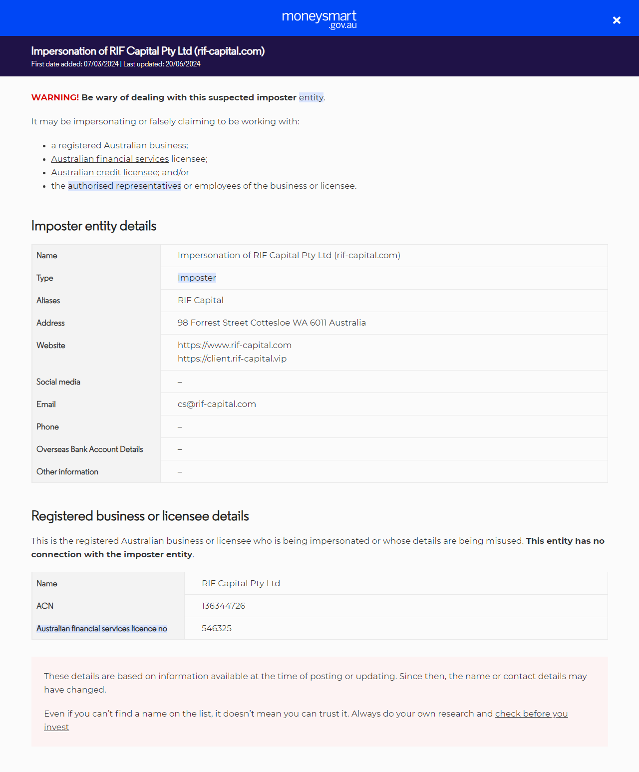 NomeImpersonação da RIF Capital Pty Ltd (rif-capital.com)
