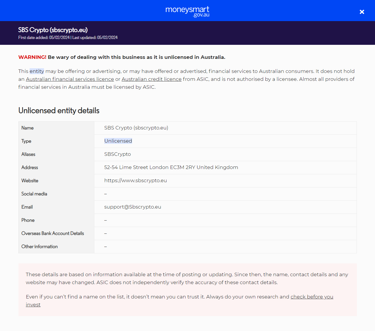 lista de alerta para investidores SBS Crypto (sbscrypto.eu).