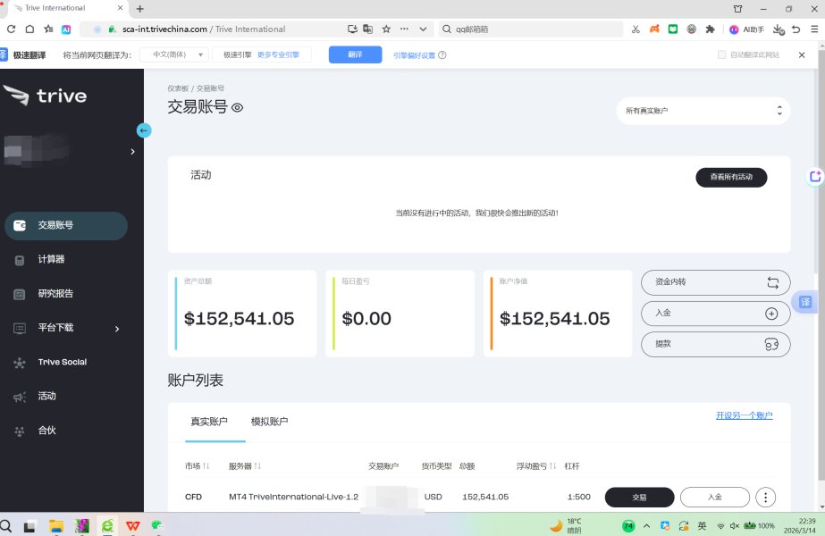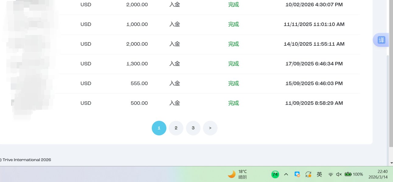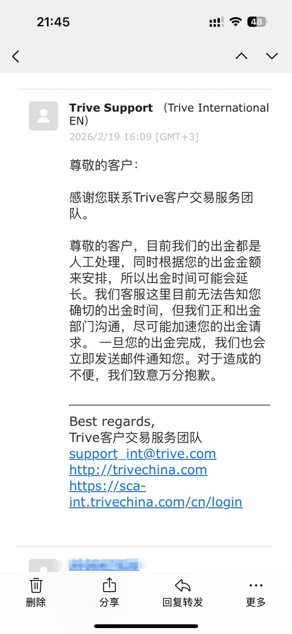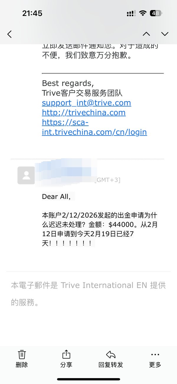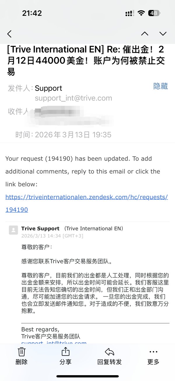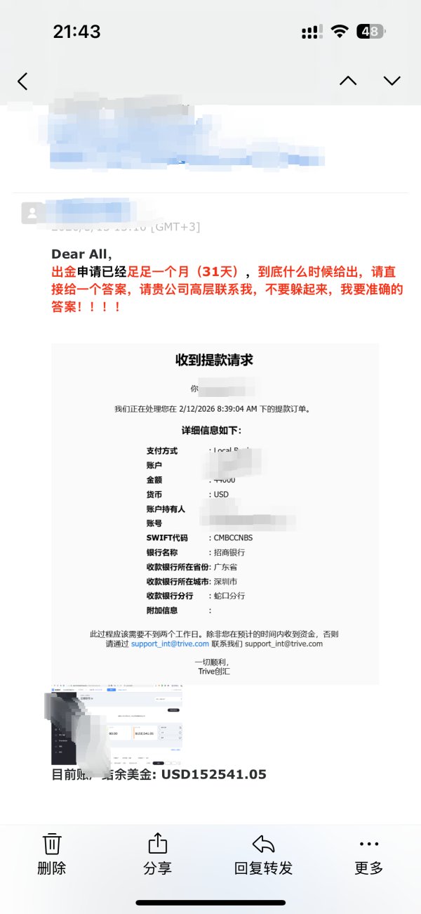 本人自2018年接触外汇大概22年转到Trive平台。 这七八年所有血汗钱全搭进去,惨不忍睹不忍直视,25年开始偶尔短线能挣点,出入金都正常。2026年春节前夕,基于本人区间预判及交易习惯,所有手动交易单基本无一犯错,盈利比较可观。 2026年2月12日,本人提交USD44000出金申请,官网邮件回复2个工作日到账,到目前已经足足一个月了(31天),本人至今未收到任何款项,官网客服一直给出的回复是无法给出确定出金时间。并且2月13日平台无故强平本人精心布局的长持单,本人账号也被禁止交易。 账户目前结余USD152541.05. 平台若是甩单赚取固定佣金就不应该干涉禁止账户,若是与客户对赌就应该保障客户盈利。客户用血汗钱在市场以命相博,若是只允许亏损爆仓不允许出现盈利,就太无耻,没有底线,早点退出别再欺骗广大汇友。 既然禁止账号交易,账号结余就必须出金给本人。 到底什么时候给出???请Trive公司直接给一个答案,请贵公司高层联系我,不要躲起来,我要准确的答案!!!!