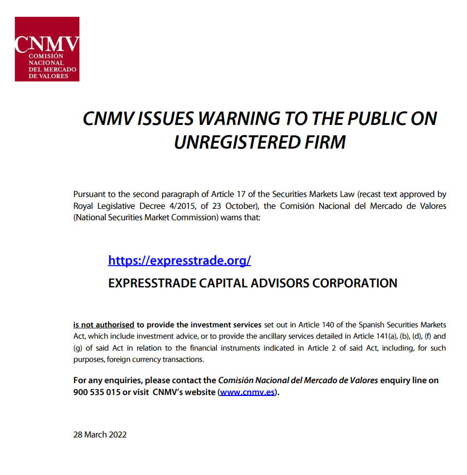 EXPRESSTRADE CAPITAL ADVISORS CORPORATION (https://expresstrade.org) 30/03/2022 Испания CNMV ВЫДАЕТ ПРЕДУПРЕЖДЕНИЕ ОБЩЕСТВЕННОСТИ О НЕЗАРЕГИСТРИРОВАННОЙ ФИРМЕ В соответствии со вторым параграфом статьи 17 Закона о рынках ценных бумаг (переработанный текст утвержден Королевским законодательным указом 4) /2015, от 23 октября), Comisión Nacional del Mercado de Valores (Национальная комиссия по рынку ценных бумаг) предупреждает, что: EXPRESSTRADE CAPITAL ADVISORS CORPORATION не уполномочена предоставлять инвестиционные услуги, изложенные в статье 140 Закона о рынках ценных бумаг Испании, которые включают инвестиционные консультации или предоставлять вспомогательные услуги, указанные в статье 141(a), (b), (d), (f) и (g) указанного Закона в отношении финансовых инструментов, указанных в статье 2 указанного Закона, включая , для таких целей осуществляются валютные операции. По любым вопросам обращайтесь в справочную линию Comisión Nacional del Mercado de Valores по телефону 900 535 015 или посетите веб-сайт CNMV (www.cnmv.es). 28 марта 2022 г.