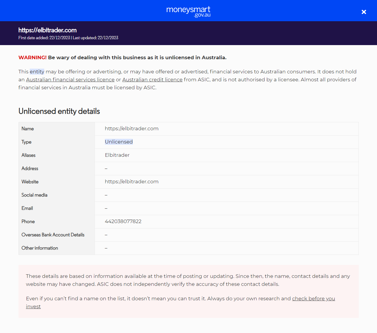 ТипНезаконное предложение финансовых услуг (включая финансовые продукты) людям в Австралии без лицензии. Они не имеют лицензии на предоставление финансовых услуг (AFS) или австралийской кредитной лицензии от ASIC.
