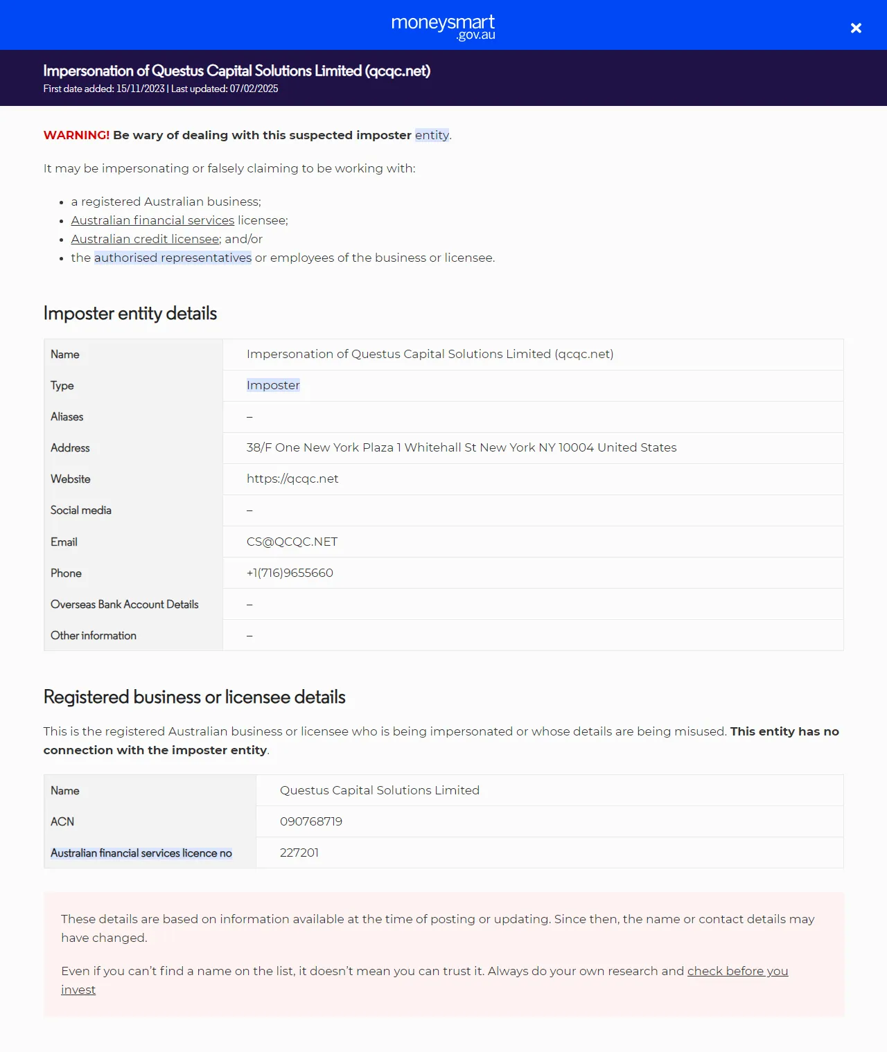 список предупреждений для инвесторовПодделка Questus Capital Solutions Limited (qcqc.net).