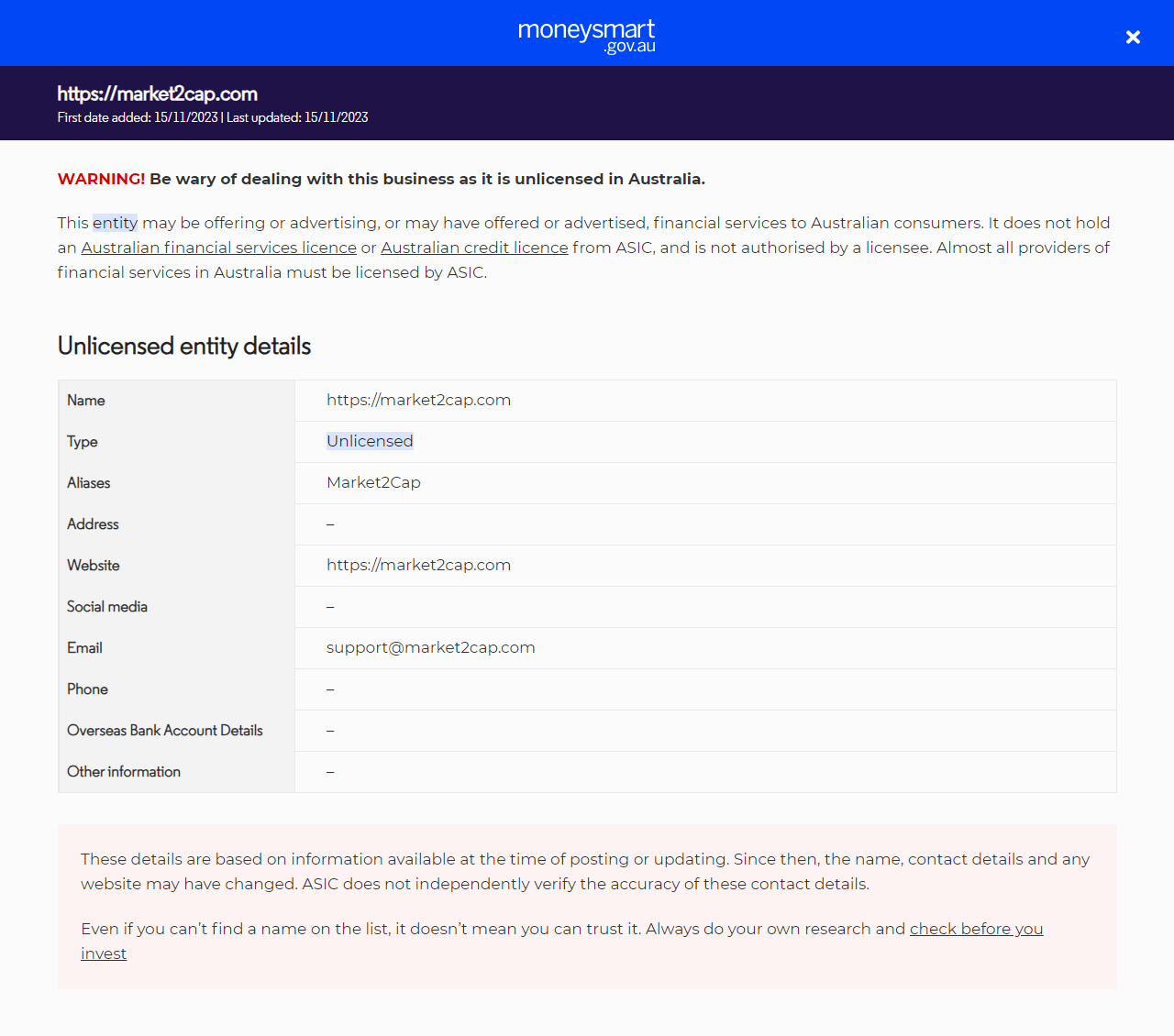 ТипНезаконное предложение финансовых услуг (включая финансовые продукты) людям в Австралии без лицензии. Они не имеют лицензии на предоставление финансовых услуг (AFS) или австралийской кредитной лицензии от ASIC.