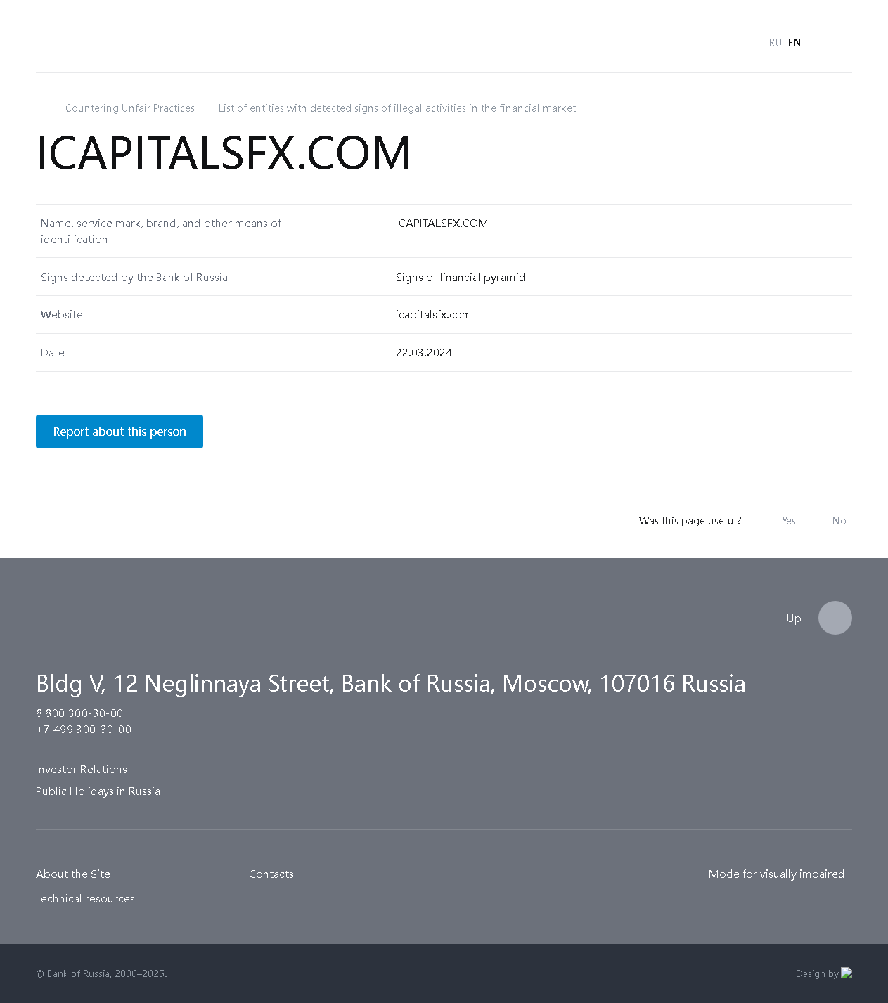 Список организаций с выявленными признаками незаконной деятельности на финансовом рынке ICAPITALSFX.COM.