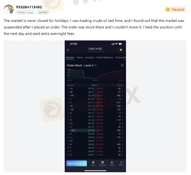 เนื้อหาการรีวิว: ตลาดไม่เคยปิดทำการในวันหยุด ครั้งล่าสุดฉันเทรดน้ำมันดิบ และพบว่าตลาดถูกระงับหลังจากที่ฉันวางออร์เดอร์ ออร์เดอร์ค้างอยู่ที่นั่นและฉันไม่สามารถเคลื่อนย้ายมันได้ ฉันถือตำแหน่งจนถึงวันถัดไปและต้องจ่ายค่าธรรมเนียมข้ามคืนเพิ่มเติม