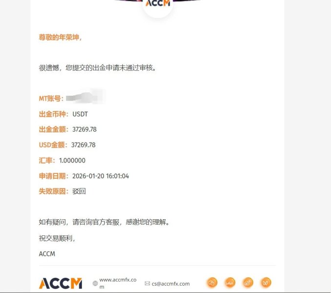 本人在 ACCM GLOBAL LIMITED 平台进行外汇交易。 本人于该平台共计入金 30000 美金,通过正常交易盈利 7269.78 美金,账户总资金为 37269.78 美金。 在整个交易过程中,本人未使用任何违规手段,包括但不限于套利、对冲、插件或异常交易行为,所有交易均为正常操作。 然而,在本人申请提现时,平台在未提供任何证据及合理解释的情况下: 直接扣除本人全部盈利 7269.78 美金 仅允许提取本金 30000 美金 随后冻结账户,限制登录及资金操作 本人多次通过邮件与平台沟通,并已向相关监管机构投诉,但平台至今完全未给予任何回复或处理结果。 该平台行为存在严重异常: 无任何违规证据即扣除盈利 通过冻结账户阻止资金流出 客服失联,拒绝沟通 本人严重怀疑该平台存在 诈骗及违规经营行为,涉嫌恶意侵占客户资金。 目前本人资金损失为:7269.78 美金(被平台扣除的盈利) 在此公开曝光该平台行为,提醒广大投资者提高警惕,避免遭受类似损失。 如平台继续拒绝处理,本人将: 持续向更多国际监管机构投诉 在全球范围内持续曝光 提交完整证据进行进一步追责