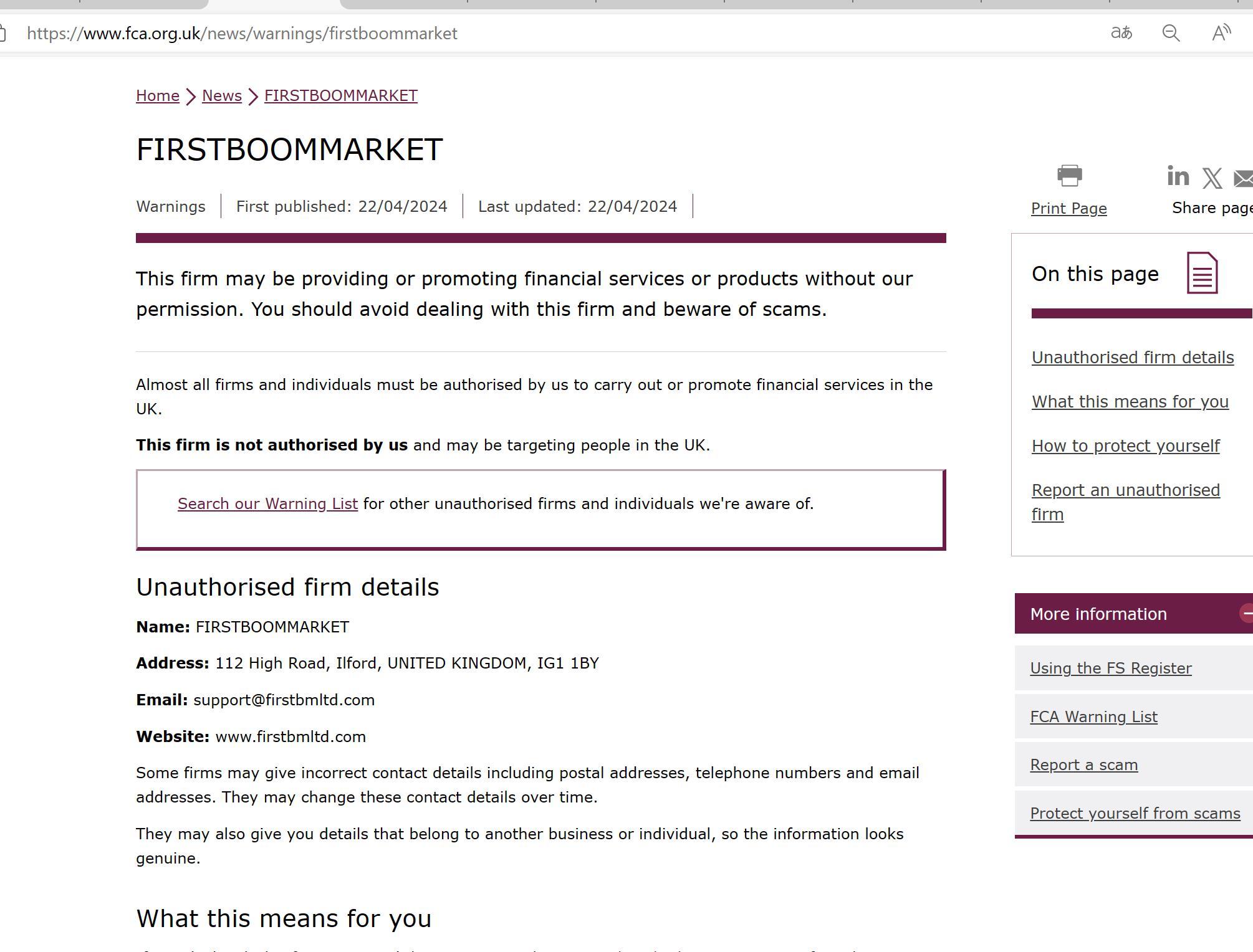 ilk yayınlanma tarihi: 22/04/2024 son güncelleme: 22/04/2024 bu firma iznimiz olmadan finansal hizmetler veya ürünler sağlıyor veya tanıtıyor olabilir. Bu firmayla çalışmaktan kaçınmalı ve dolandırıcılıklara karşı dikkatli olmalısınız. Birleşik Krallık'ta finansal hizmetleri yürütmek veya tanıtmak için neredeyse tüm firma ve kişilerin tarafımızdan yetkilendirilmesi gerekir. Bu firma bizim tarafımızdan yetkilendirilmemiştir ve İngiltere'deki insanları hedef alıyor olabilir. Bildiğimiz diğer yetkisiz firma ve kişileri bulmak için uyarı listemizde arama yapın. Yetkisiz firma ayrıntıları adı: FIRSTBOOMMARKET adres: 112 high road, ilford, birleşik krallık, ig1 1 e-postayla: support@firstbmltd.com web sitesi: www.firstbmltd.com bazı firmalar posta adresleri, telefon numaraları ve e-posta adresleri gibi yanlış iletişim bilgileri verebilir. zamanla bu iletişim bilgilerini değiştirebilirler. ayrıca size başka bir işletmeye veya bireye ait ayrıntıları da verebilirler, böylece bilgiler gerçek görünür.