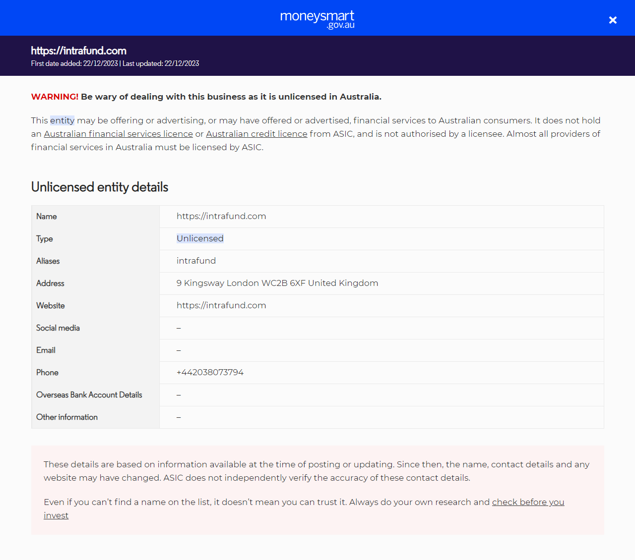 Avustralya'da lisanssız olarak insanlara finansal hizmetler (finansal ürünler dahil) sunuyor. ASIC'den bir Avustralya finansal hizmetler (AFS) lisansı veya Avustralya kredi lisansına sahip değiller.