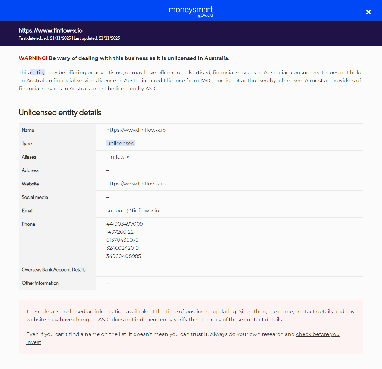 Avustralya'da insanlara lisanssız olarak finansal hizmetler (finansal ürünler dahil) sunuyor. ASIC'den bir Avustralya finansal hizmetler (AFS) lisansı veya Avustralya kredi lisansı bulunmuyor.