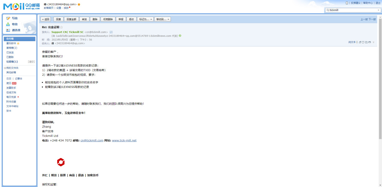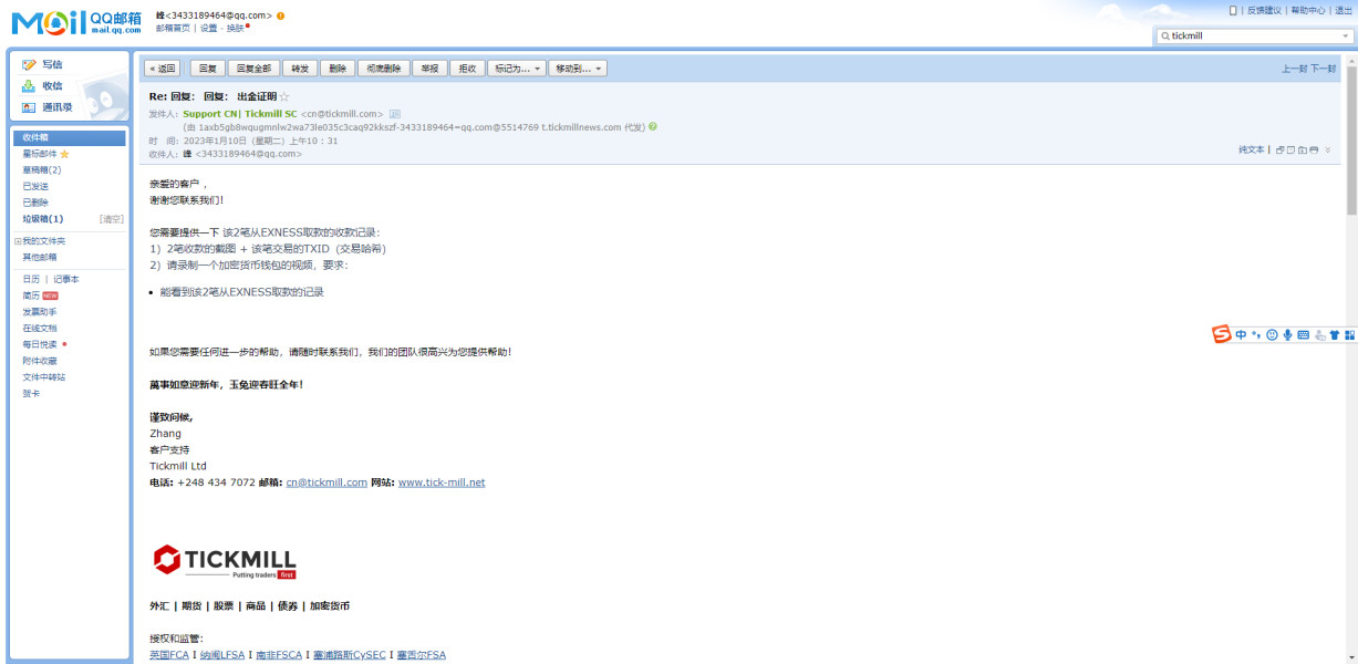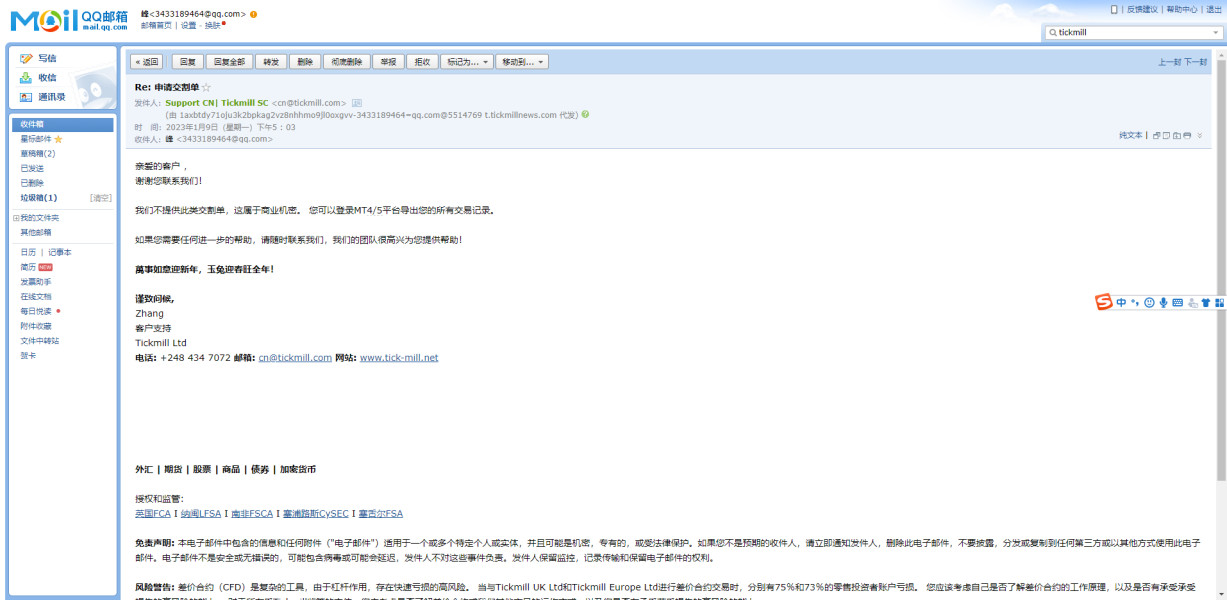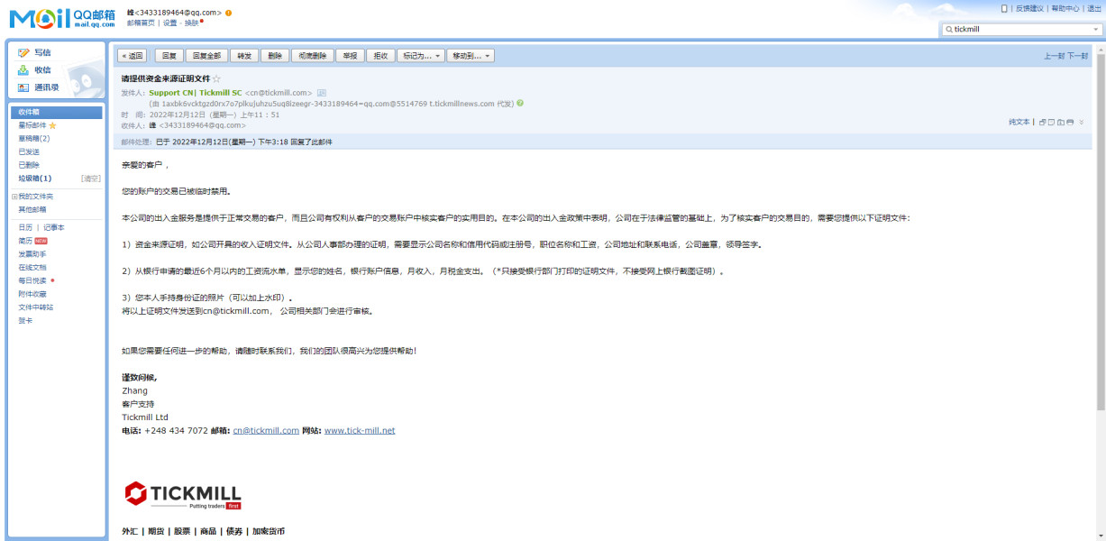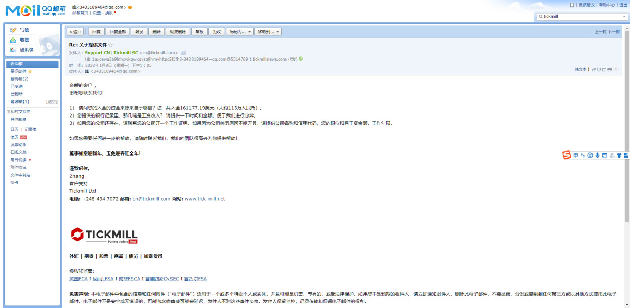 我2022年11月17日陆续在这个平台入金共计16万余美金,至12月15亏损达6万余美金,账户余额9万8千美金左右,期间从未出金。tickmill无征兆禁用交易账户,让我提交工作证明,收入证明,否则就一直不出金。至2023年1月11日我已提交30余封邮件的资料,还要让我继续等待审核。我想问问是欺负中国人吗?有机会我肯定去当面问问他们。为什么这么嚣张?敢做出这么不合理不合法的事情?我发邮件申请我所做交易的交割单,以证明平台把单子抛向市场,回复我说是商业机密,不许查看,(附有邮件截图)真是让人不耻。(tickmillAPP截图4张是我期间入金的记录)(附有tickmill索取无理材料的邮件截图)