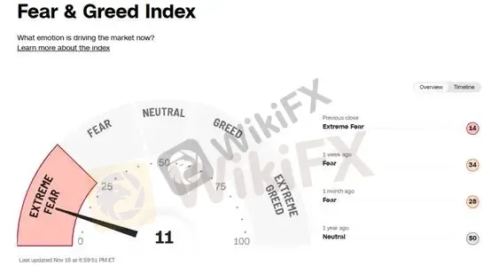 Theo chỉ báo phản tâm lý thị trường, Chỉ số Fear & Greed của CNN giảm mạnh xuống mức một chữ số trong phiên, và chốt ngày tại 11%, rơi vào vùng cực kỳ hoảng sợ.