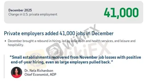 Lời nói đầu:Dữ liệu ADP tháng 12 của Mỹ ghi nhận mức tăng 41.000 việc làm, cho thấy thị trường lao động bắt đầu xuất hiện tín hiệu phục hồi. Theo báo cáo, đà cải thiện chủ yếu đến từ các ngành giáo dục – y tế và