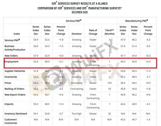 Cùng ngày (08), bên cạnh dữ liệu ADP, chỉ số ISM PMI dịch vụ (NMI) tháng 12 cũng được công bố. So sánh chi tiết việc làm giữa khu vực sản xuất và dịch vụ cho thấy: