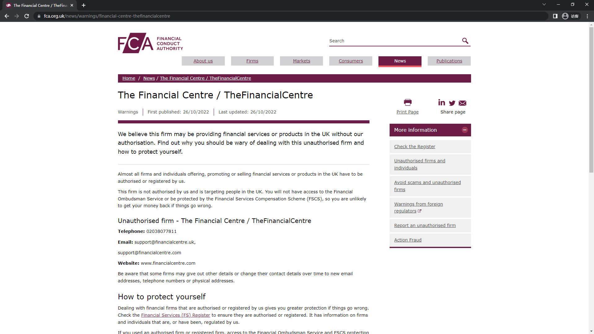 chúng tôi tin rằng công ty này có thể đang cung cấp các dịch vụ hoặc sản phẩm tài chính ở Anh mà không có sự cho phép của chúng tôi. tìm hiểu lý do tại sao bạn nên cảnh giác khi giao dịch với công ty trái phép này và cách tự bảo vệ mình. hầu hết tất cả các công ty và cá nhân cung cấp, quảng bá hoặc bán các dịch vụ hoặc sản phẩm tài chính ở Anh phải được chúng tôi cho phép hoặc đăng ký. công ty này không được chúng tôi ủy quyền và đang nhắm mục tiêu đến những người ở Anh. bạn sẽ không có quyền truy cập vào dịch vụ thanh tra tài chính hoặc được bảo vệ bởi chương trình bồi thường dịch vụ tài chính (fscs), vì vậy bạn khó có thể lấy lại tiền của mình nếu xảy ra sự cố. công ty trái phép - The Financial Centre / các FinancialCentre điện thoại: 02038077811 email: support @ FinancialCentre .uk, hỗ trợ @ FinancialCentre .com trang web: www. FinancialCentre .com lưu ý rằng một số công ty có thể cung cấp các chi tiết khác hoặc thay đổi chi tiết liên hệ của họ theo thời gian thành địa chỉ email, số điện thoại hoặc địa chỉ thực mới.
