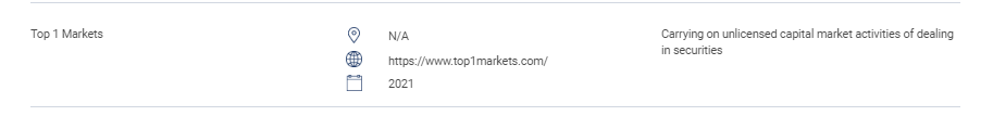 "phần này chứa danh sách các trang web, sản phẩm đầu tư, công ty và cá nhân trái phép. danh sách này bao gồm: những người thực hiện hoặc tự mình thực hiện các hoạt động được quy định sau đây mà không có giấy phép từ sc: kinh doanh chứng khoán; kinh doanh các công cụ phái sinh; quản lý quỹ; tư vấn về tài chính doanh nghiệp; tư vấn đầu tư; lập kế hoạch tài chính; và kinh doanh các chương trình hưu trí tư nhân. người điều hành một thị trường được công nhận mà không được phép. " TOP1 Markets n/a https://www.top1markets.com/ 2021 thực hiện các hoạt động giao dịch chứng khoán trên thị trường vốn không được cấp phép